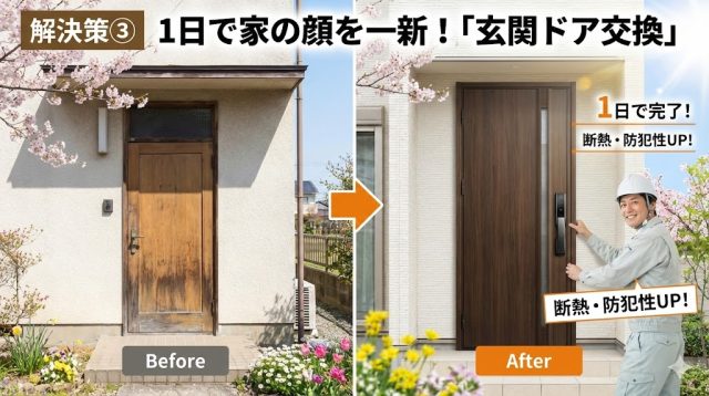 「玄関が見違えるように!」(Y様) 1日で玄関が変わると聞いてお願いしました。本当に夕方には新しいドアになっていて、家全体の雰囲気が明るくなりました。 |